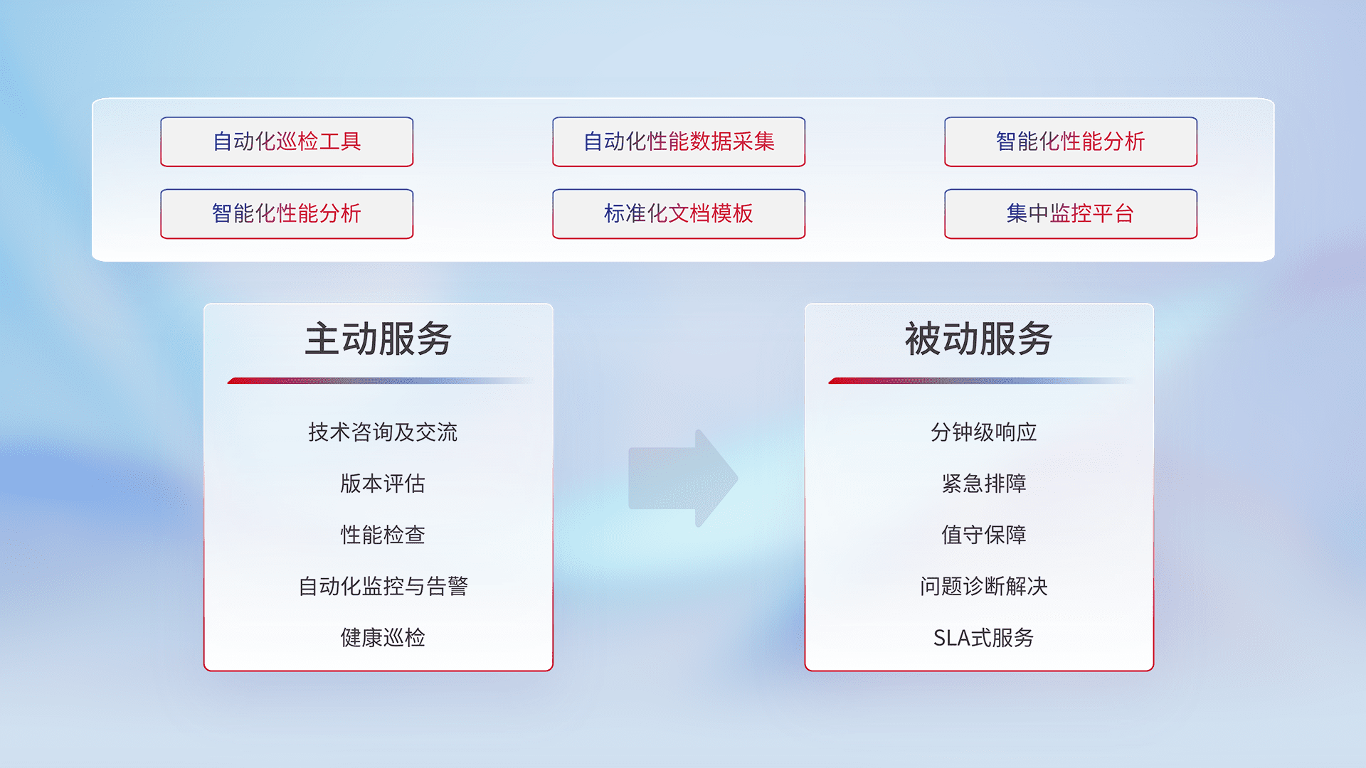 智能化工具和标准化文档,,,,保障服务质量,,,提供主动服务(包含技术咨询、、、、版本评估、、、性能检查、、自动化监控与告警、、、、健康巡检)和被动服务包含(分钟级响应、、紧急排障、、、值守保障、、、、问题诊断解决、、、SLA服务)。。